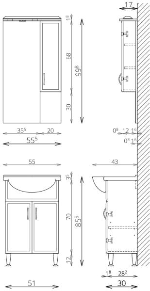 A Tboss Classic 55 fürdőszoba szekrény együttes rengeteg tárolóhelyének köszönhetően, fürdőjében mindennek megtalálja a helyét. A bútorszett két részből tevődik össze, a felső rész amely beépített, halogén fényű világítással ellátott tükörből és ajtóval felszerelt polcrendszerből áll, a bútor alsó rész pedig mosdó alatti szekrényből és kerámia mosdót