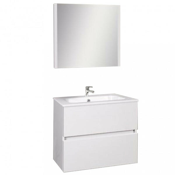 A készlet a következőket tartalmazza Csuklós mosdószekrény Méretek: 635 x 788 x 480 mm 2 x fiók, hangtalanul záródó, rögzített fogantyúkkal anyag: erősen tömörített 3 rétegű DTD, lakkozott, nedvességvédelemmel ellátott szín: fényes fehér összeszerelve szállítva beleértve a szekrényrögzítő készletet Bútor mosdókagyló túlfolyóval méretek: 800 x 480 x 168 mm a