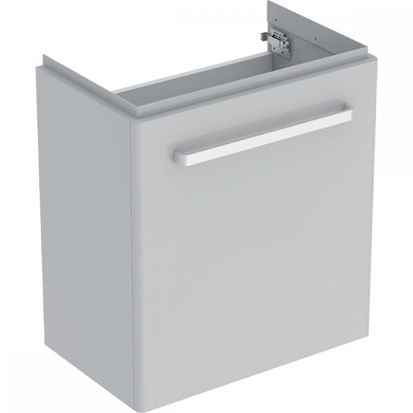 Geberit Selnova Compact 1 ajtós alsó szekrény mosdóhoz 60 cm, szerviztérrel, fényezett világosszürke 501.615. 42.1 Tulajdonságok Méretek: 55x60,4x36,7 cm Szélesség: 55 cm 60 cm-es mosdókhoz Test: világosszürke/matt bevonat Előlap: világosszürke/fényezett, erősen csillogó Alapanyag: nagy tömörségű háromrétegű farostlemez Falra szerelhető Egy ajtóval Fogantyú a nyitás