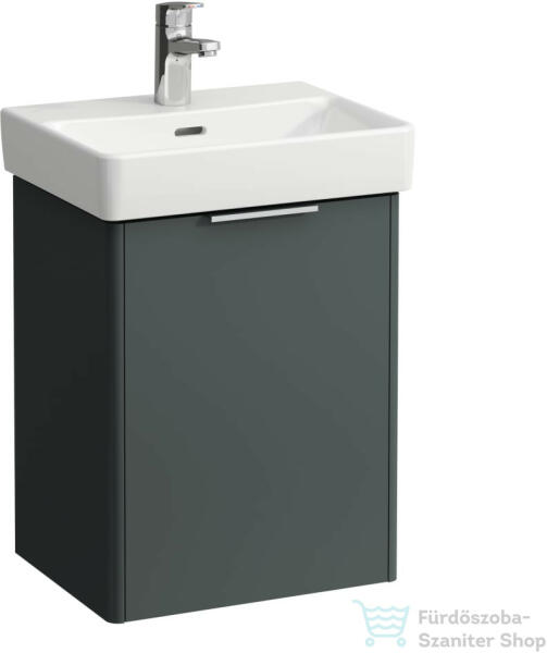Laufen Base matt antracitszürke alsószekrény 41,5x51,5x32,1 cm balos ajtóval H4021111102661 Laufe Pro S H815961 mosdó variációihoz Telepítés: fali, lábbal kiegészíthető Súly: 11,5 kg Alapanyag: MDF Felület: PVC fólia és ABS élek Szín: matt antracitszürke Méret : 41,5x32,1x51,5 cm Kivitel: egy ajtóval (zsanér a bal oldalon ) Fékezett záródással (soft-close mechanizmus) In