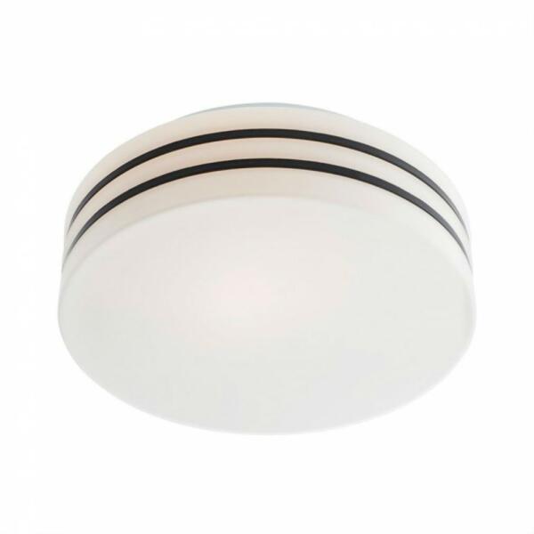 Kerek, fürdőszobai mennyezeti lámpa fém vázzal, fekete szilikon gyűrű dekoros opál üveg búrával, IP44-es védelemmel.