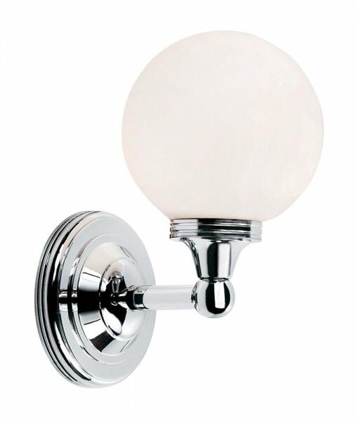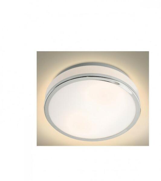 Kerek, fürdőszobai mennyezeti lámpa fém vázzal, króm színű gyűrű dekoros opál üveg búrával, IP44-es védelemmel.