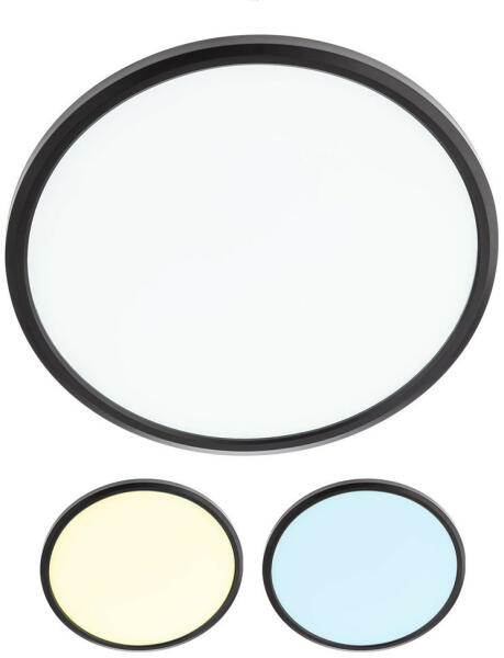 Fekete keretes, fehér színű műanyag, ABS mennyezeti lámpa 15W beépített LED fényforrással, IP54-es védelemmel. A lámpa színhőmérséklete fali kacsoló segítségével allítható 3000/4000/6500K között.
