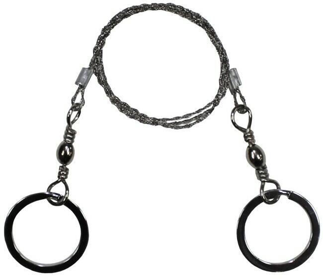 Drótfűrész, 2 gyűrűvel, extra erős kialakítással8-szoros tekercselt speciális drótfémgyűrűk forgó láncszemekkelDrótátmérő: kb. 1,5 mmGyűrű belső átmérője: kb. 25 mmTeljes hossz: kb. 60 cmVágási hossz: kb. 51 cmSúly: kb. 20 g