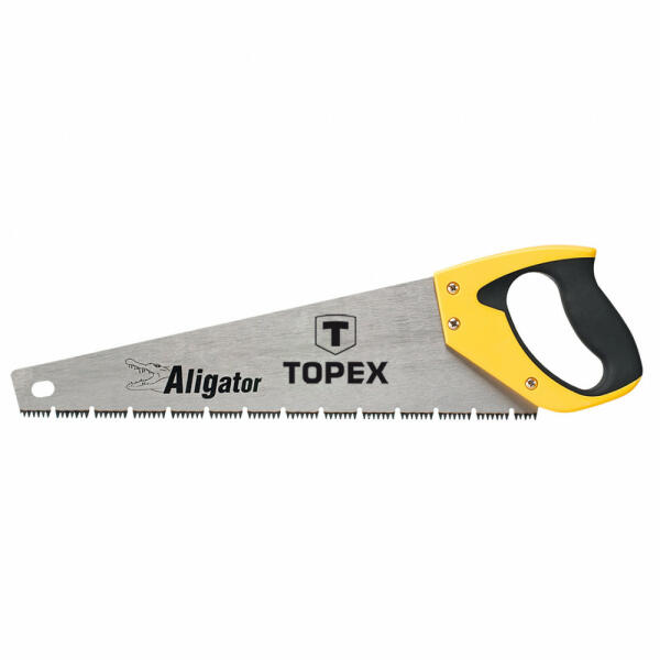 Topex Aligator rókafarkfűrész. A fogak edzése és háromsíkú élezése jelentősen csökkenti a vágási ellenállást, és megkönnyíti a fűrészelést szálirányban. A hatékony, collonként 7 db-os fogazás eredményesebb megmunkálást tesz lehetővé. Megkülönbözteti a gyors vágást lehetővé tevő különleges szerkezete. Az ergonómikus bimateriál markolat segíti a precíz v