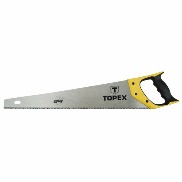 A Topex Shark rókafarkfűrész edzett acélból készül. A fogak edzése és háromsíkú élezése jelentősen csökkenti a vágási ellenállást, és megkönnyíti a fűrészelést szálirányban. Az igen hatékony, collonként 11 db-os fogazás eredményesebbé teszi a munkát. Az ergonómikus bimateriál markolat segíti a precíz vezetést, a csúszásmentes bevonat pedig megakadályozza k
