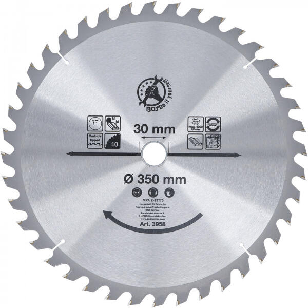 Mpa Által Tanúsított Keményfém Fogak Furatátmérő: 30 Mm Bruttó Súly: 1644 G Fordulatszám Max. : 4300 Ford/Min Átmérő: 350 Mm Vágásszélesség: 3,4 Mm Fűrészlap-Vastagság: 2,2 Mm Fogak: 40