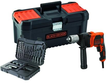 Gyártó: Black & Decker Modell: BEH850KA32-QS Leírás: Teljesítménye 85W. Kofferban értékesítjük, fém gyorstokmány, 1 sebességfokozat, puha markolat, jobb-bal forgásirányban konstans teljesítmény, pótfogantyúval. Üresjárati fordulatszám 0-3100/ min. Fúrás teljesítmény fában/fémben/kőzetben : 32/13/16 mm.