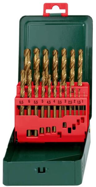 HSS-TiN fúró doboz, 19 részes, "Promotion" HSS-TiN fém fúrók, tintán-nintrit bevonatú kivitel, csiszolt, hengeres, N típus, 135°-os keresztcsiszolás, arany színű felület, fém dobozban. Jellemzők: Ø 1- 10 x 0,5 mm · Alkalmas furatokhoz acélban, acél öntvényben, ötvözetben, ötvözet nélküli anyagban, szürke öntvényben, NE fémekben, műanyagban · Max. 900 N/mm2 szakít