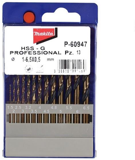 Makita fémfúró készlet HSS-G 1,5-6,5mm 13db/csom (P-60947) Köszörült fúrószárak, ipari felhasználásra, edzett, kiváló minőségű gyorsacélból DIN338 szerint Jobbravágó spirálfúró 135°-os fúrócsúcs harántköszörüléssel "N" típusú (Normál) horony 64-65 HRC (Rockwell) felületi keménység Önközpontosító tulajdonság Átmérőtűrés h8 Ötvözött és ötvözetle