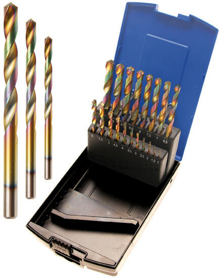 Optimum HSS-CO 5% csigafúró készlet 1-13mm 25 részes 25 db-os fúrószár készlet, méret 1 - 13 mm A DIN 338 szerint HSS-CO 5% A 135°-os élkeresztmetszet kiváló önközpontosítást tesz lehetővé Megnövelt élettartam ötvözött alapanyagok révén Nagy sebesség / előtolási értékek Az erős magkialakítás optimalizálja a fúró szerkezeti szilárdságát és minimalizálja a f