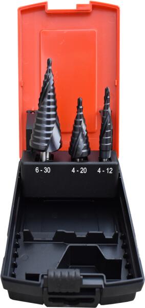 ABRABORO HSS-TiAlN lépcsős fúró készlet 4-12/4-20/4-30mm az iSzerszámnál. Professzionális, ipari minőségű 3 részes ABRABORO HSS-TiN lépcsős fúró készlet 4-12/4-20/4-30mm. Tartalma: 1 db D 4,0-12,0 mm 1 db D 4,0-20,0 mm 1 db D 4,0-30,0 mm. Lépcsős fúró nagy felületkeménységet biztosító Titán-Alumínium-Nitrid (TiAlN) bevonattal. Gyors munkavégzés, hosszú élettartam. A