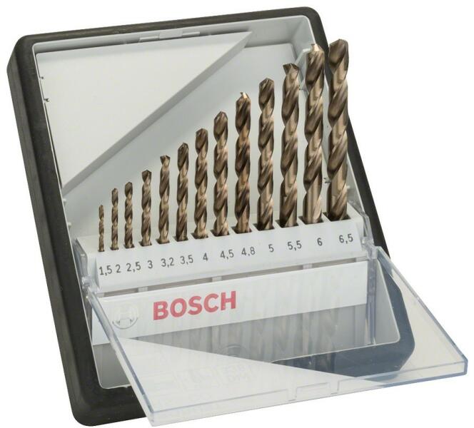 A Bosch HSS-Co Robust line 13 részes fémfúró készlet alkalmas ötvözött és ötvözetlen acél megmunkálásához 1000 N/mm2 szakítószilárdságig, rozsdamentes acél (V2A/V4A), szürkeöntvény, acélöntvény, sav- és hőálló acélok megmunkálásához. Precíziós fúrók kiváló hőállósággal és kopásállósággal. 135°-os fúrócsúccsal. DIN 338 szabvány szerint. Használ