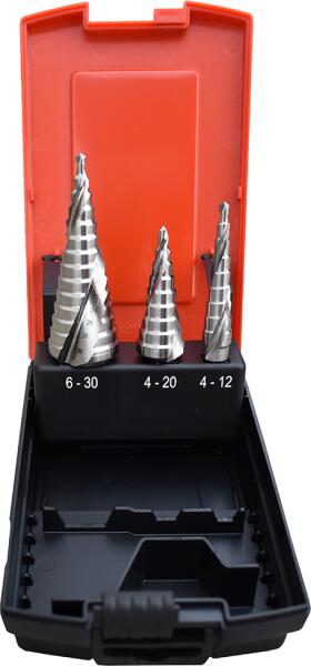 ABRABORO HSS-Co lépcsős fúró készlet 4-12/4-20/4-30mm az iSzerszámnál. Professzionális, ipari minőségű 3 részes ABRABORO HSS-Co lépcsős fúró készlet 4-12/4-20/4-30mm. Tartalma: 1 db D 4,0-12,0 mm 1 db D 4,0-20,0 mm 1 db D 4,0-30,0 mm. HSS-Co lépcsős fúró, 5% kobaltot tartalmazó gyorsacélból. HSS gyorsacélból készült fúró, speciális spirálhoronnyal, kötött fúrási