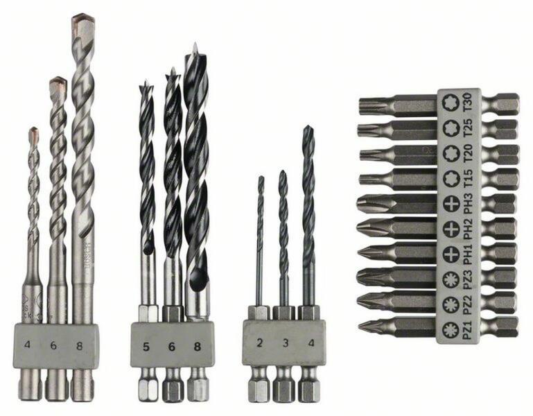 BOSCH Uneo vegyes készlet 2609256989 Átmérő mm x hosszúság mm, kő, SDS quick - 4,0x85 - 6,0x100 - 8,0x120 Átmérő mm x hosszúság mm, fa 1/4" Hex - 5,0x97 - 6,0x102 - 8,0x112 Átmérő mm x hosszúság mm, fém 1/4" Hex - 2,0x69 - 3,0x73 - 4,0x87 Csavarhúzóbitek (50 mm), csavarfej - PH1 - PH2 - PH3 - PZ1 - PZ2 - PZ3 - T15 - T20 - T25 - T30 Megfelelő a következőhöz megmunkálható a