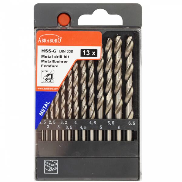 A készlet 13 darab HSS-GS rövid hengeres szárú ipari minőségű fémcsigafúrót tartalmaz, amely nagy teljesítményű HSS gyorsacélbólkészült, DIN 338 szabvány szerint. Ezüst színű fúrószár. Jobbos spirálfúró, önközpontosító, N típusú, 135o-os Split point fúrócsúccsal rendelkezik, átmérőtűrése h8. Javasolt ötvözött és ötvözetlen acél (max. szakítószilár