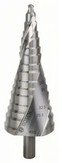 A Bosch HSS 16 lépcsős fúró használható nemvasfémhez, acéllemezhez, műanyaghoz. Előfúrás nélkül a legvékonyabb lemezek megmunkálásához sorjamentesen, hidegen felhegedés nélkül. Köszörült fúró háromszögletű szárral, peremsüllyesztéssel, fix fúrási lépcsőkkel. Az átmérője 6-38,5 mm, a hossza 125,5 mm, a szárátmérő 10 mm, M10 - M40 fokozatátmérő. A tartó