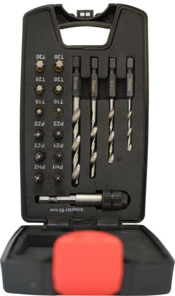 Tartalma: Bitek: 1xPH1, 1xPH2, 1xPZ1, 3xPZ2, 1xT10, 1xT15, 1xT20, 1xT25, 2xT30 Fafúró rövid, E 6,3 befogással: 3mm , 4 mm , 5 mm, 6 mm 1xTEMPO mágneses bitszár
