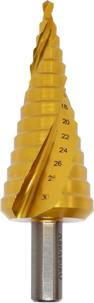 ABRABORO HSS-TiN lépcsős fúró 4,0-12,0x1x6x69mm az iSzerszámnál. Professzionális, ipari minőségű ABRABORO HSS-TiN lépcsős fúró 4,0-12,0x1x6x69mm. Lépcsős fúró nagy felületkeménységet biztosító Titán-Nitrid bevonattal. Méret: D4-12 mm. Emelkedés: 1 mm. Szár: d6 mm. Lépcsők: 4 | 5 | 6 | 7 | 8 | 9 | 10 | 11 | 12 mm. Hossz: 69 mm. Arany színű. Gyors munkavégzés, hossz
