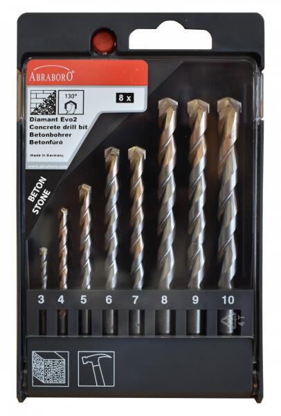 ABRABORO Hengeres szárú betonfúró készlet 8 részes 3-10mm diamant EVO2 az iSzerszámnál. Rövid kivitelű, profi minőségű, nagy teljesítményű ütvefúró. Különösen hőálló betonfúró, extra hosszú élettartammal. Valamennyi ütvefúrógépben használható, így költséget takarít meg a használatával. 130°-os keményfém fúrócsúccsal, Twinmax spirállal készül a nagy