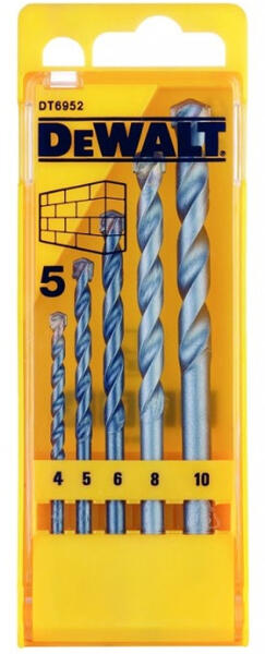 DEWALT DT6952-QZ Kőzetfúrószár készlet - 5 db-os Jellemzők: HM-falfúró 130°, Douglas forma 10-13 mm átmérőjű fúrók 9,5 mm szárátmérőre csökkentése, 13 mm átmérő feletti fúrók 12,7 mm szárátmérőre csökkentve Alka lmazási terület: Szerel s- és rögzítéstechnika Beton ban, falazatban, terméskőben, műkőben, téglában stb. használatra alkalmas Készle t tartalm