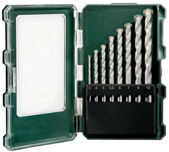 METABO Kőzetfúró készlet, 8db-os, 3-10mm (626706000) Term kinformáció: Kőf úró fúró és ütvefúrókhoz Mart kivitel, keményfém lapka 130° Robusztus kivitel Alkalmazható tégla, falazat és természetes kövekben végzett fúrásokhoz stb. 8 db-os, kiváló minőségű, robusztus műanyag dobozban, speciális Metabo dizájnnal, kihúzható Euroloch-akasztóval; Keményfém kőzetfú