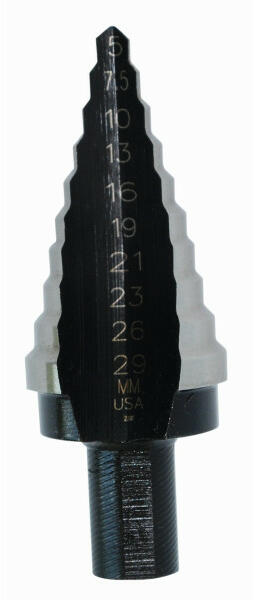 IRWIN lépcsős fúró 29MM 10 Furatméretek 5 / 7,5 / 10 / 13 / 16 / 19 / 21 / 23 / 26/ 29 mm ÖNKÖZPONTOSÍTÓ CSÚCS - Nincs kilengés, nincs szükség központosításra. FÚRÓSZÁRTEST - Króm-vanádium acélból készült. Keménység: 56 HRC FORGÁCSHORONY - Extra mély köszörült dupla forgácshorony az extra forgácsolási kapacitás érdekében. Ideális vékony anyagok, pl. közepes