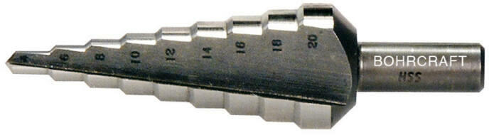 Bohrcraft HSS lépcsős lemezfúró jellemzői 14 lépcsős No. 3A Lépcsős lemezfúró: 4-30 mm 2 mm-es lépcső Teljes edzésű, köszörült, nagy teljesítményű HSS anyagból készült szerszám, mely hosszú élettartamot és extra tartósságot biztosít Mindegyik lépcső egy adott méretű párhuzamos oldalfalú furat előállítására alkalmas A megmunkálható anyag vastagságát a l