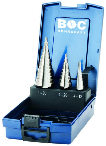 BOHRCRAFT lépcsős lemezfúró készlet HSS 3 részes 4-30mm STB3-K ABS-Box az iSzerszámnál. BOHRCRAFT lépcsős lemezfúró készlet HSS 3 részes 4-30mm STB3-K ABS-Box. Lépcsős lemezfúró: 4-12; 4-20; 4-30mm. Teljes edzésű, köszörült, nagy teljesítményű HSS anyagból készült szerszám, mely hosszú élettartamot és extra tartósságot biztosít. Mindegyik lépcső egy adott mér