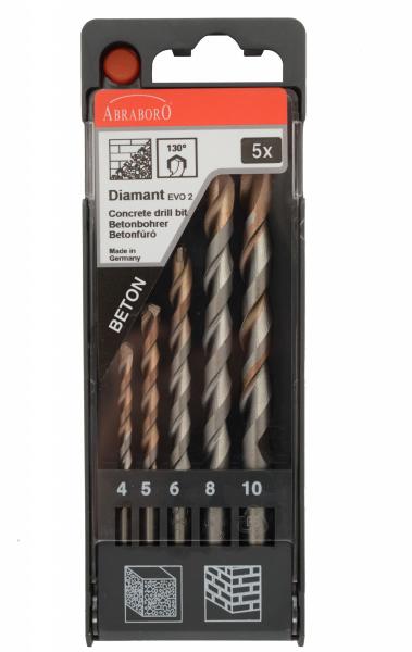 ABRABORO Hengeres szárú betonfúró, ütvefúró készlet 5 részes diamant EVOlution2 az iSzerszámnál. Rövid kivitelű, profi minőségű, nagy teljesítményű ütvefúró. Különösen hőálló betonfúró, extra hosszú élettartammal. Valamennyi ütvefúrógépben használható, így költséget takarít meg a használatával. 130°-os keményfém fúrócsúccsal, Twinmax spirállal ké