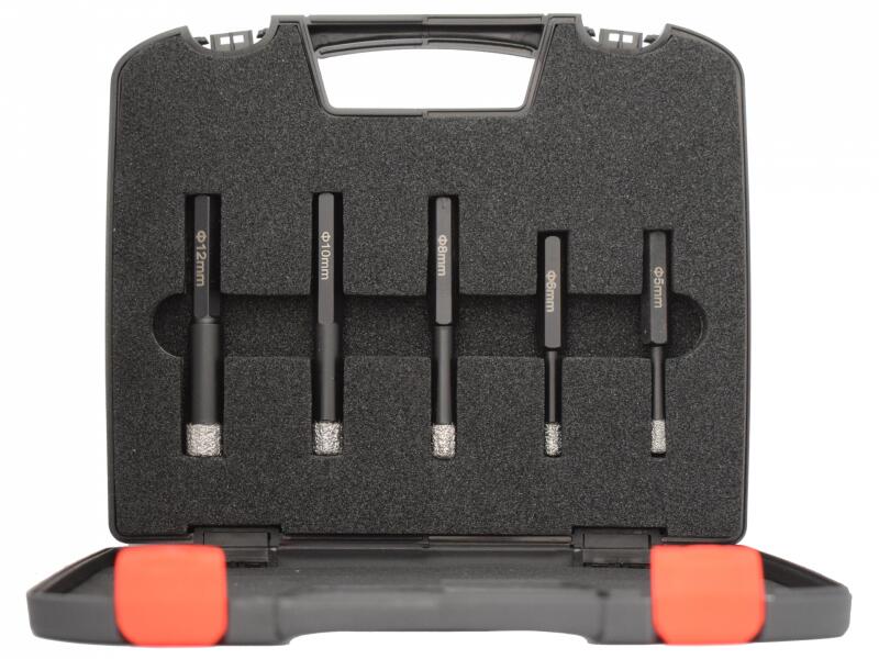 ABRABORO Gyémántszemcsés csempe és kerámiafúró készlet 5 részes az iSzerszámnál. Speciális fúrószár gyémántszemcse-bevonattal, hatszög szárral. Önélező, agresszív vágóél. Egyszerű használat. Ajánlott: csempe, kerámia és márvány fúrásához. Használata: magas fordulatszám-tartományban, kizárólag megfelelő hűtéssel. Fúrósablon használata javasolt, de nem
