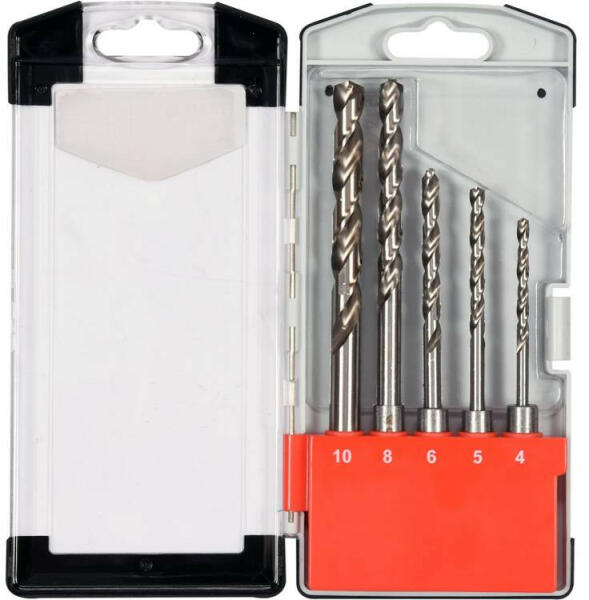 SDS-Plus csigafúró készlet fémhez HSS, 5 részes Méret: 4-5-6-8-10 mm SDS-Plus szárral, ütés nélküli fúrásra Csúcsszög: 135° Köszörült Műanyag dobozban SDS-Plus befogású csigafúrók fémek fúrására. Fúrás csak sima forgással, ütés nélkül. Anyag: HSS 6542 gyorsacél, köszörült SDS-Plus befogás Csúcsszög: 135° Műanyag dobozban DIN338 Méretek: 4x105/43 mm 5x11