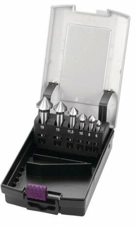 Optimum Süllyesztőfúró készlet 6/8/10/11,5/15/19 mm 6 részes 6-részes, a készletben megtalálható méretek: 6/8/10/11,5/15/19 mm A DIN 335C szabvány szerint gyártva Átm. : 5,0, 6,0, 8,0, 10,0 mm-es hengeres szárral 90°-os kúppal HSS gyorsacél alapanyagból Kiváló minőségű süllyesztők: a sorját megtöri és jól eltávolítja, anélkül, hogy karcolásokat okozna Kompatibili