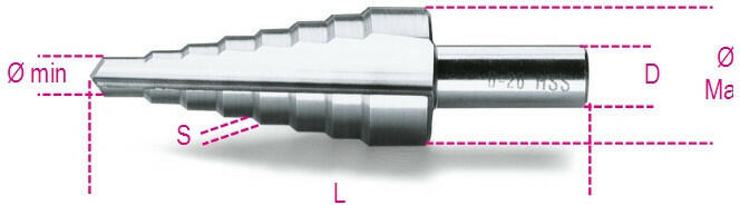 Beta 425/6, Lépcsős lemezfúró, HSS, 30÷40 Jellemzők: D: 13 mm S: 1 mm Ø: 30÷40 mm L: 97,0 mm A Beta márkát az olaszországi Beta Utensili S. p. A. gyártja és forgalmazza, mely 1923-ban kezdte meg működését. Az olasz, családi tulajdonban lévő vállalatot immár az ötödik generáció vezeti. A Beta professzionális, kimagasló minőségű kézi szerszámok gyártásával foglalk