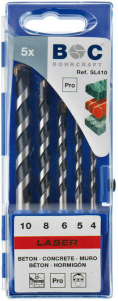 A kőzetfúró készlet adatai Német Bohrcraft gyártmány 5db-os fúrókészlet Hagyományos befogás ( a fogaskoszorús tokmányba tehető) Méretek: 4-5-6-8-10mm Műanyag dobozban A készletben lévő fúrószár adatai Hengeres szárú Lézer hegesztett betonfúró Keményfémlapkás, 130°-os élszöggel, Bohrcraft betonfúró alkalmazása Alkalmas betonra, téglára, eternitre, egyéb könn