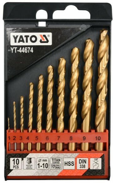 Fémfúró készlet 10 részes 1 mm-től 10 mm-ig, HSS 6524 acélból, titán-nitrid bevonatú, professzionális ipari felhasználásra. Anyag: HSS 6524 Alkalmazás: rozsdamentes acél, saválló acél, hidegen hengerelt acél Felület kidolgozása: titán-nitrid bevonatú, polírozott Átmérő: 1, 2, 3, 4, 5, 6, 7, 8, 9, 10 mm Befogó mérete: 1/4" (6,3 mm) Teljes hossz: 34, 49, 61, 75, 86, 93,