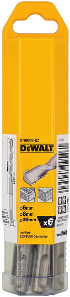 DT60302-QZ - SDS-Plus fúrószár készlet, 6 db-os Dübelek, aljzatok, rögzítőelemek, vezetékek helyének kialakítására. Tégla, falazóelem, kő fúrására. Tartalom: 2x DeWalt SDS Plus 6mm x 160mm-es fúrószárak 2x DeWalt SDS Plus 8mm x 160mm fúrószárak 2x DeWalt SDS Plus fúrófej 10mm x 160mm Specifikációk: Fejlett kovácsolási technológia, hosszú élettartam Speciálisan ki