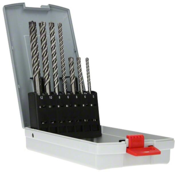 BOSCH SDS-Plus 7X Betonfúró készlet - 7 részes Az SDS plus-7X fúrószár kiváló élettartamot nyújt vasbeton fúrása esetén. Tömör keményfém 4 élű feje a legkiválóbb minőségű keményfémből készül, amely megerősíti a fejet, és kivételesen jó ütésállóságot biztosít. A fúróerő egyenletes elosztása garantálja, hogy nincs teljesítményveszteség, és ez megnöv
