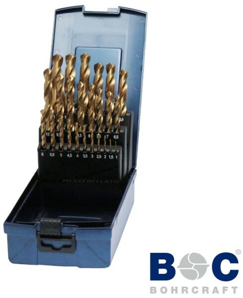 HSS-TiN KT13 ABS-Box fémfúró készlet TiN (titán-nitrid) bevonat Hengeres befogás ABS műanyag tároló doboz DIN 338 Edzett, nagy teljesítményű gyorsacélból. 118°-os fúrócsúccsal. Görgőshengerelésű kétspirálú, két vágóélű, köszörült éllel, TiN bevonattal. Spirálhorony a gyors forgácskihordás érdekében. Nagyfokú rugalmasság, csekély törésveszély, hosszú é
