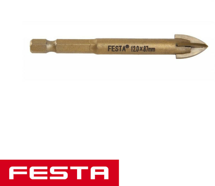 Négyélűüveg és csempefúrószár 1/4" hex - 12 mm Keményfém fúróhegy TiN bevonattal Speciális fúró precíz és gyors fúráshoz üvegben, kerámiában, kemény burkolatban és burkolóanyagban, valamint más rendkívül kemény anyagokban nem csak az építőiparban. Négyélű keményfém hegy TiN bevonattal, rozsdamentes acél test és 1/4" hatszögletű befogás. Ha kemény burkolat