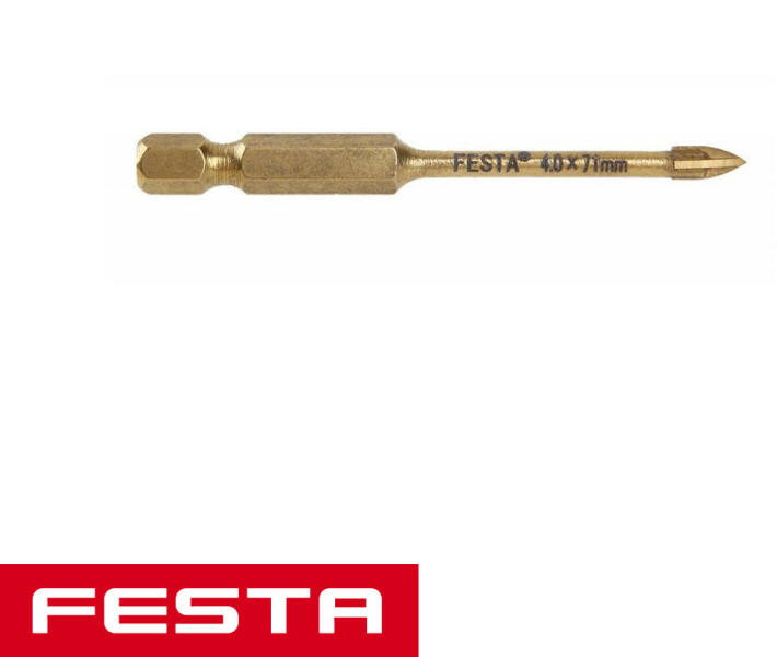 Négyélűüveg és csempefúrószár 1/4" hex - 4 mm Keményfém fúróhegy TiN bevonattal Speciális fúró precíz és gyors fúráshoz üvegben, kerámiában, kemény burkolatban és burkolóanyagban, valamint más rendkívül kemény anyagokban nem csak az építőiparban. Négyélű keményfém hegy TiN bevonattal, rozsdamentes acél test és 1/4" hatszögletű befogás. Ha kemény burkolatb