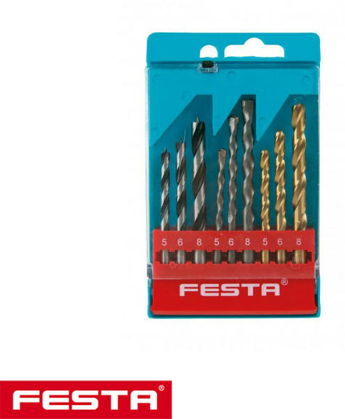 Fúrókészlet fa-fém-kőzet szárakkal (Ø 5-6-8 mm) Műanyag tartóban 9 darab szár FESTA fúrószár készlet fához, falazathoz és fémhez 5, 6 és 8 mm átmérőben, hengeres szárral Minőségi anyagok és kivitelezés A TiN bevonatú fémfúrók rozsdamentes anyagokhoz is használhatók Praktikus műanyag csuklós dobozban