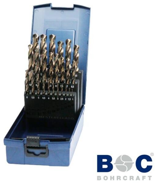 HSS-TiN MT13 Metal-Box fémfúró készlet TiN (titán-nitrid) bevonat Hengeres befogás Fém tároló doboz DIN 338 Edzett, nagy teljesítményű gyorsacélból. 118°-os fúrócsúccsal. Görgőshengerelésű kétspirálú, két vágóélű, köszörült éllel, TiN bevonattal. Spirálhorony a gyors forgácskihordás érdekében. Nagyfokú rugalmasság, csekély törésveszély, hosszú élettar