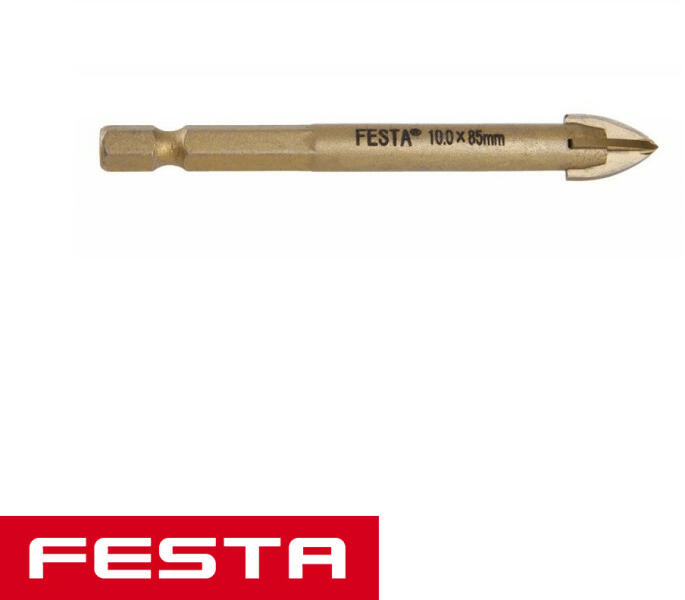 Négyélűüveg és csempefúrószár 1/4" hex - 10 mm Keményfém fúróhegy TiN bevonattal Speciális fúró precíz és gyors fúráshoz üvegben, kerámiában, kemény burkolatban és burkolóanyagban, valamint más rendkívül kemény anyagokban nem csak az építőiparban. Négyélű keményfém hegy TiN bevonattal, rozsdamentes acél test és 1/4" hatszögletű befogás. Ha kemény burkolat