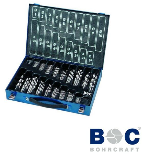 HSS-G MG170 Metal-Box köszörült fémfúró készlet Hengeres befogás Fém koffer DIN 338 Teljes edzésű, nagy teljesítményű gyorsacélból. 118°-os fúrócsúccsal, harántköszörült. Két vágóélű, kétspirálú, köszörült hengeres fúró, fényes felülettel. A befogószár megfelel a furatátmérőnek. Alkalmas ötvözött és ötvözetlen acélhoz, acélöntvény, szürkeöntv