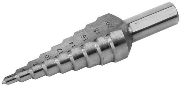 lépcsős fémfúró, 13 lépcsős (6-30mm, 2mm lépcsők) befogás: 10mm Anyaga: HSS gyorsacél (DIN 1412C) Elsősorban vékony anyagok, pl. lemezek fúrásához ajánlott, max. 4mm-ig! Alkalmas műanyagokhoz és normál acéllemezekhez, vékonyfalú zártszelvényekhez, stb. , de nem használható edzett vagy saválló acélhoz! Alacsony fordulatszámon kell használni és fúrás közben gondos