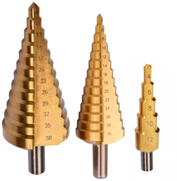 Lépcsős fúró fémhez, acél- és lágyöntvényhez, műanyaghoz Edzett, magas minőségű gyorsacélból titánium bevonattal Meghatározott fúrási lépcsők Előfúrás nélkül vékony lemezhez, ...