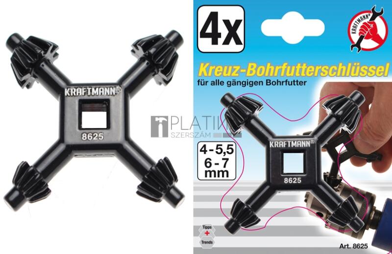 Angol nyelvű leírás (a magyar fordítást lásd lejjebb):for most drill chuck sizessuitable for AEG, Bosch, Skil, Black & Decker, Makita, Milwaukee etc. Pins Ø 4 - 5.5 - 6 - 7 mmMagyar fordítás (fordító automata segítségével):a legtöbb fúrószerszámmérethezalkalmas AEG, Bosch, Skil, Black & amp; Decker, Makita, Milwaukee stb. ins 4 - 5,5 - 6 - 7 mm-es csapokA Kraftmann term