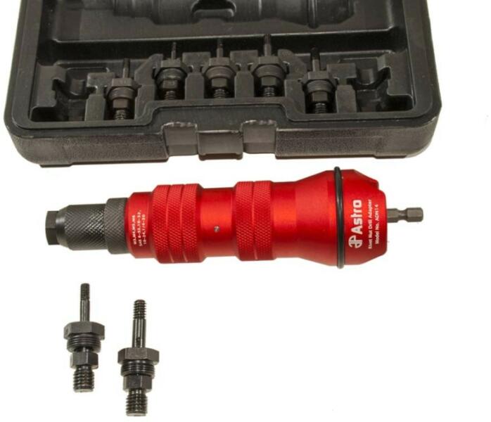 Fúrógéphez és akkus csavarbehajtóhoz is könnyedén használható professzionális adapter szegecsanyák behúzásához. Használható: Alumínium, acél, réz, rozsdamentes acél szegecsanyákhoz. A készlet tartalma 1 db adapter (hossz: 160mm) 8-8 db menetes tüske és behúzófej Méret: M3, M4, M5, M6, 8-32, 10-32, 10-24, 1/4-20 1 db tokmánykulcs A használt fúrónak/csavarbehajtónak n