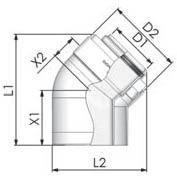PPs/Alu könyök 110/160mm, 45°45° L1= 234 mm L2= 207 mm x1= 110 mm x2= 70 mm